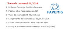 A Chamada 01/2026 - Demanda Universal tem por objetivo estimular a qualidade, a pluralidade e a diversidade da pesquisa científica e tecnológica nas diversas áreas do conhecimento. Para mais informações, acesse a página da Agência: https://fapemig.br/oportunidades/chamadas-e-editais/10765