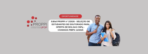 ![]() A PROPPI torna público o Edital nº 2/2026 para seleção de estudantes de Doutorado para oferta de bolsas CNPq - Chamada PIBPG 12/2025. As inscrições serão iniciadas no dia 22/02/2026. No ato da submissão das propostas, a pessoa proponente deverá encaminhar produção acadêmica e plano de trabalho... |